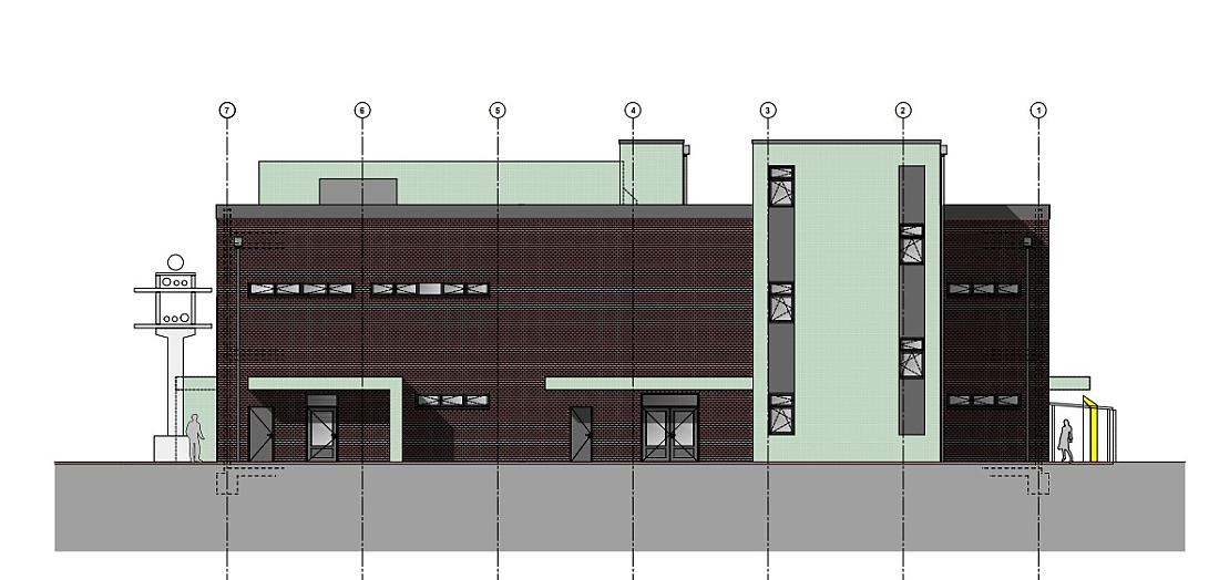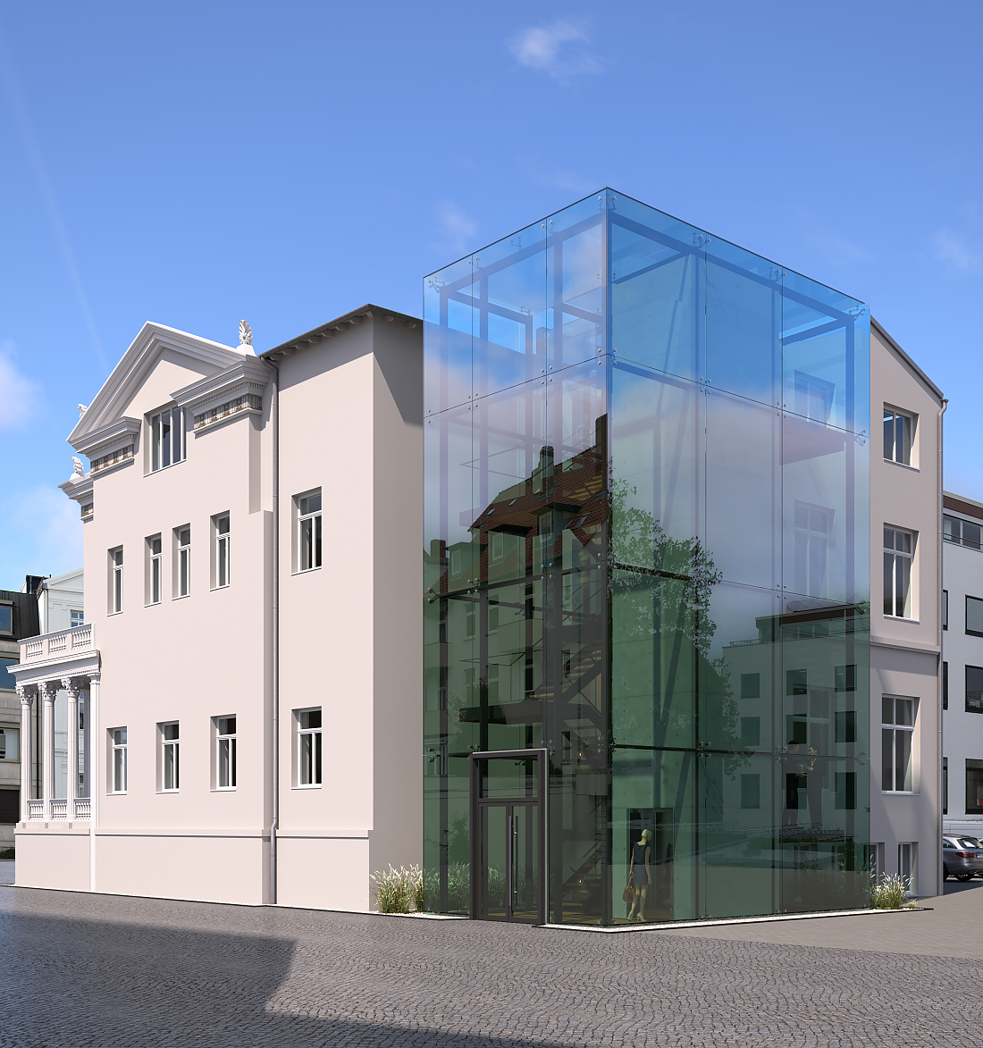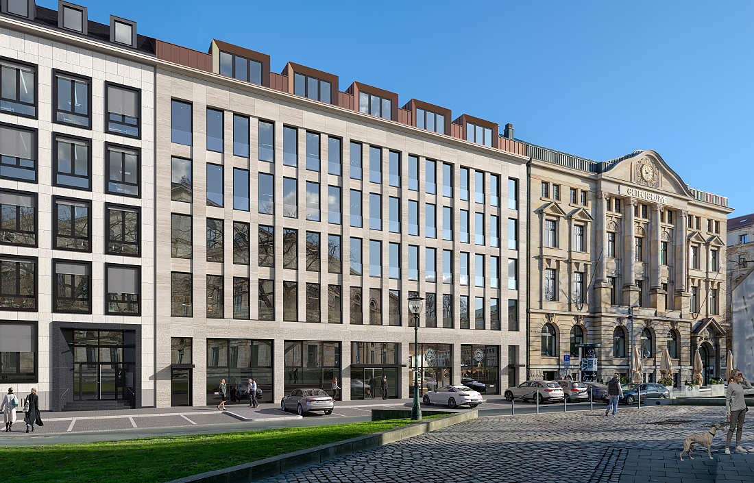 Das Gebäude erhält straßenseitig eine zeitgemäße, wärmegedämmte Vorhangfassade mit neuer Gliederung aus großformatigen, bodentiefen Fensterelementen und Natursteinbändern. Die Natursteinplatten orientieren sich, aus Gründen des Denkmalschutzes, farblich an der Nachbarbebauung.