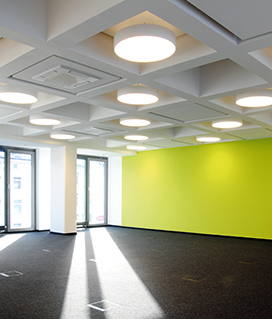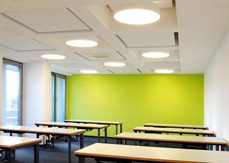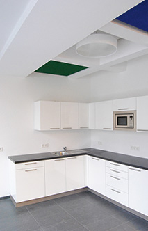 Die Farbgestaltung der Schulungs- und Aufenthaltsräume fördert eine angenehme Atmosphäre und trägt zum Wohlbefinden der Mitarbeiter bei.