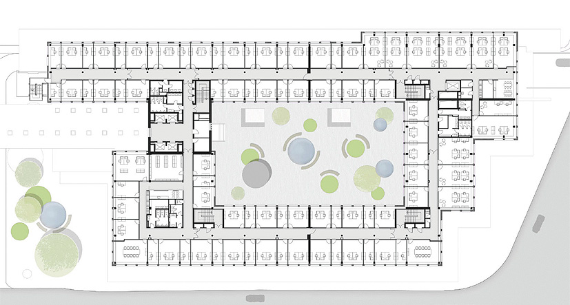 Die neu angelegten Parkplatzflächen haben ein Rückgrat aus begrünten Stelen und sind durchsetzt von Rasenschrägen, die in Form von Hochbeeten Rückzugs- und Ruheräume bilden.