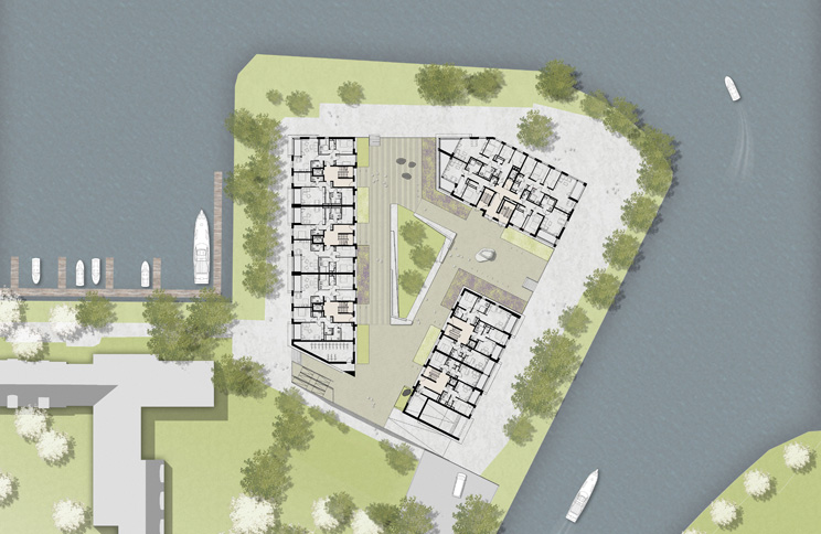 Der Entwurf mit drei Gebäuden unterschiedlicher Höhe, die sich um einen Innenhof gruppieren. Das höchste Gebäude liegt an der Spitze der Halbinsel und bildet mit seiner markanten Kubatur den Eingang zum Yacht- und Wendehafen.