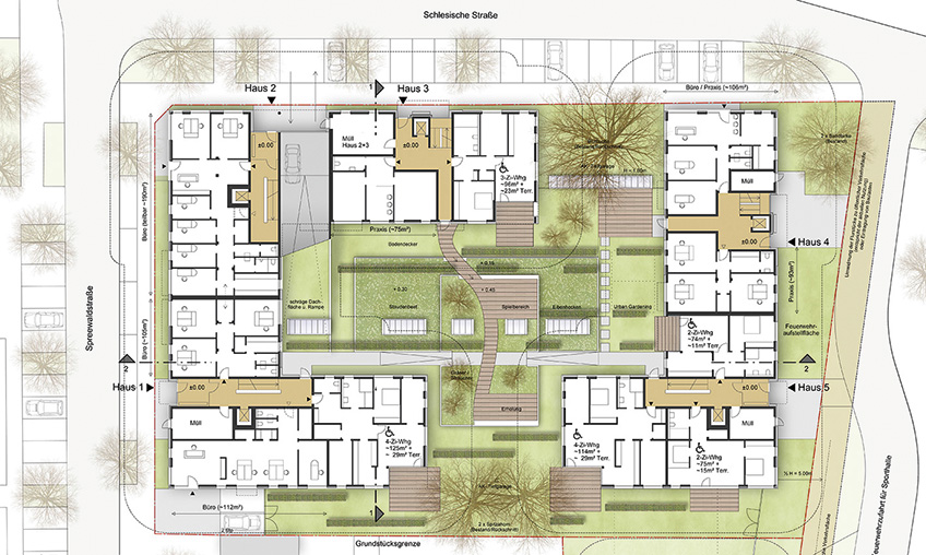 Im Erdgeschoss sind fünf Gewerbeeinheiten mit einer Büro- und Praxisnutzung und einer Größe von ca. 100 m² bis ca. 280 m² sowie drei rollstuhlgerechte Wohnungen von ca. 60 m² bis 124 m² angeordnet. In den zwei Obergeschossen sind jeweils 16 Wohneinheiten angeordnet. Im Dachgeschoss befinden sich 10 Penthouse-Wohnungen.
