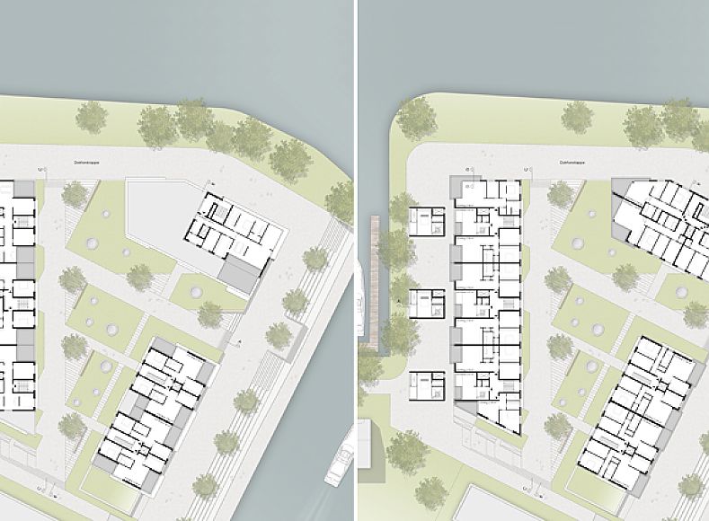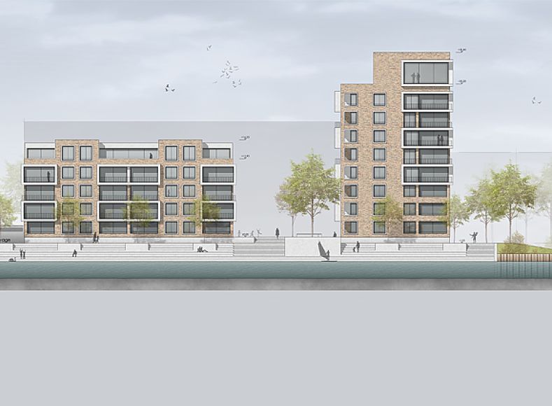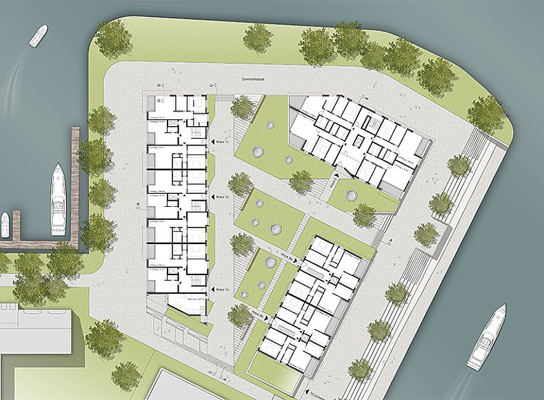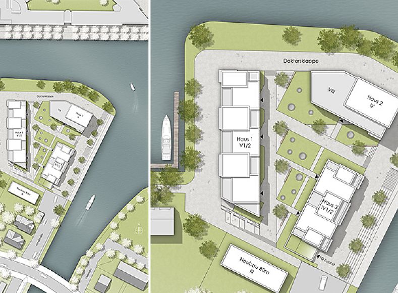 Ziel des Planungswettbewerbs ist die Neuorientierung der Halbinsel „Doktorsklappe" in Oldenburg. An drei Seiten von Wasser umgeben, bildet das Gebäudeensemble, bestehend aus drei bis zu neungeschossigen Gebäuden, den neuen Eingang zum Yachthafen.