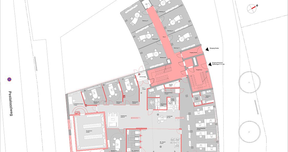 Im Zuge des Umbaus wird eine neue Raumaufteilung mit neuem Kassenbereich und einer Mietfachanlage im Erdgeschoss realisiert. Hierzu ist eine komplette Entkernung der Fläche erforderlich.