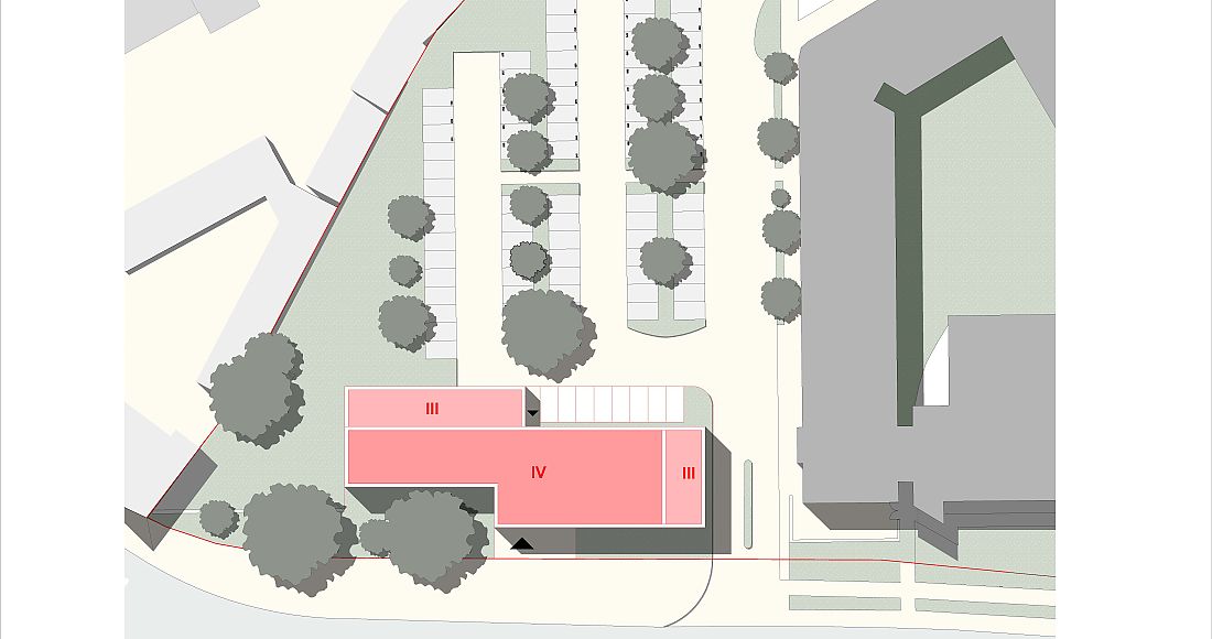Geplant ist ein 4- geschossiger Baukörper mit Teilunterkellerung und Staffelgeschoss mit Dachterrassennutzung. Ein zentraler Kern mit Erschließung, Sanitäranlagen und Nebenräumen im Zentrum des Gebäudes ermöglicht eine flexible Aufteilung der Büroflächen. Das Gebäude kann in bis zu 7 unterschiedliche Nutzereinheiten aufgeteilt werden, die aufgrund der Organisation des Grundrisses geschossweise zusammengeschlossen werden können.