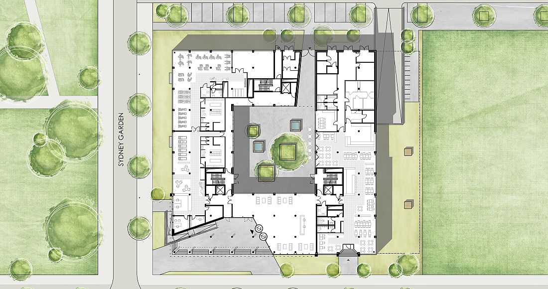 Die CLOSE mbH plant den Neubau eines Bürogebäudes – entsprechend den Baugrenzen ist es auf insgesamt sechs Etagen und einem Untergeschoss konsequent quadratisch angelegt. Vom zentralen Haupteingang sind über verglaste Arkadengänge entlang des Innenhofes drei Treppenhäuser zu erreichen. Durch diese separaten Zugänge lassen sich die Büroebenen flexibel pro Etage in einer Einheit oder auch in bis zu fünf Einheiten planen. Die unterschiedlichen Gebäudetiefen ermöglichen sowohl den klassischen zentralerschließenden Mittelflur mit Einzelbüros als auch offene Bürokonzepte. Geschosshohe Glasflächen an allen Fassaden lassen das Tageslicht tief in das Gebäude fluten. Das Projekt spiegelt die Anforderungen moderner Arbeitswelten mit seiner zeitlosen und ansprechenden Architektur wieder und wird dem ehemaligen EXPO-Standort im Süden von Hannover einen ganz besonderen Touch verleihen.