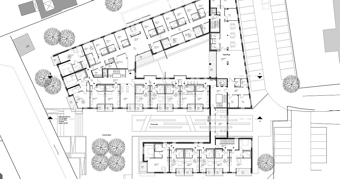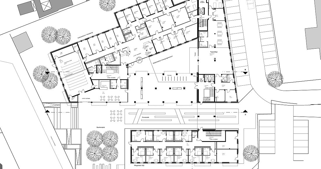 • Unterschiedliche Nutzungen (Wohnen / Soziales / Pflege) werden in einer Begegnungsstätte zusammengefasst und bieten somit für das Quartier einen Sammelpunkt der Aktivitäten und Bedürfnissen von älteren Menschen.