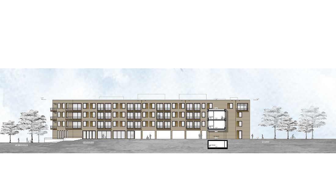 • Unterschiedliche Aufenthaltsqualitäten im Außenbereich (Arkaden = geschützter Außenbereich / Quartiersplatz = Boule Spiel unter Bäumen / offener Platz vor Kulturzentrum = Versammlungsbereich / Innenhof = geschützter Bereich für Tagespflege)