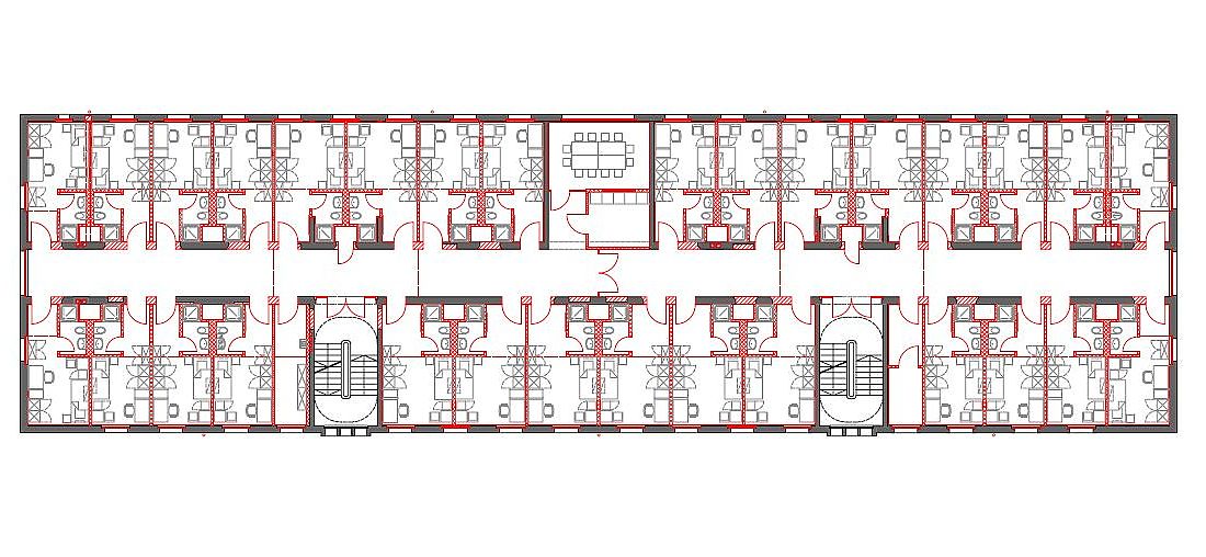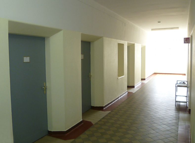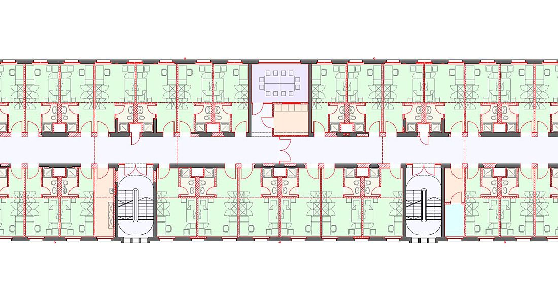 Die vorhandene Bausubstanz aus den 30er Jahren wurde bisher in seiner ursprünglichen Raumstruktur mit Schlafsälen, sowie Gemeinschaftswasch- und Toilettenbereichen genutzt. Durch die Sanierung des Gebäudes wird die Nutzung als Unterkunftsgebäude im Hotelstandart umgesetzt mit 90 Einzelzimmern und direkt zugeordneten Nassbereichen. Die allgemein für alle Nutzer zu Verfügung stehenden Studienräume und Teeküchen sind zukünftig zentral im Gebäude angeordnet. Zur Optimierung der Raumstrukturen für die Unterkunftsräume werden tragende Wände entfernt und durch Stahlkonstruktionen ersetzt.