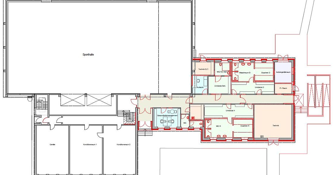 Der Gebäudeteil der Umkleiden wird kernsaniert. Umgesetzt werden Maßnahmen zur: