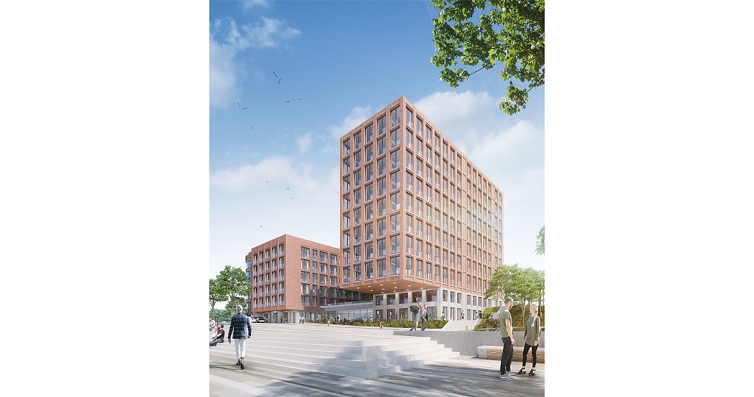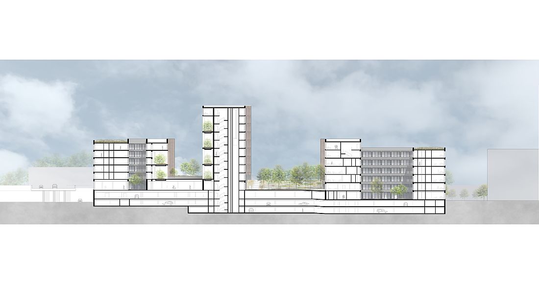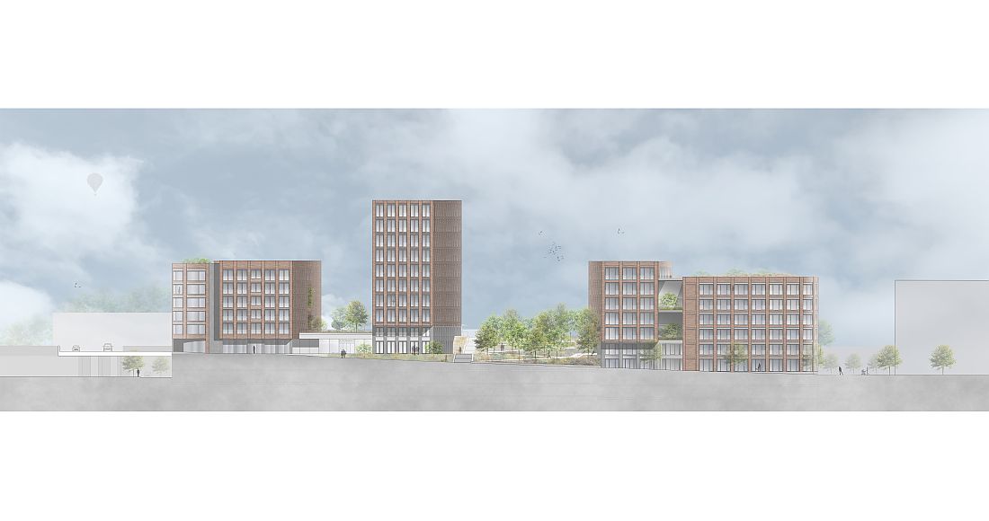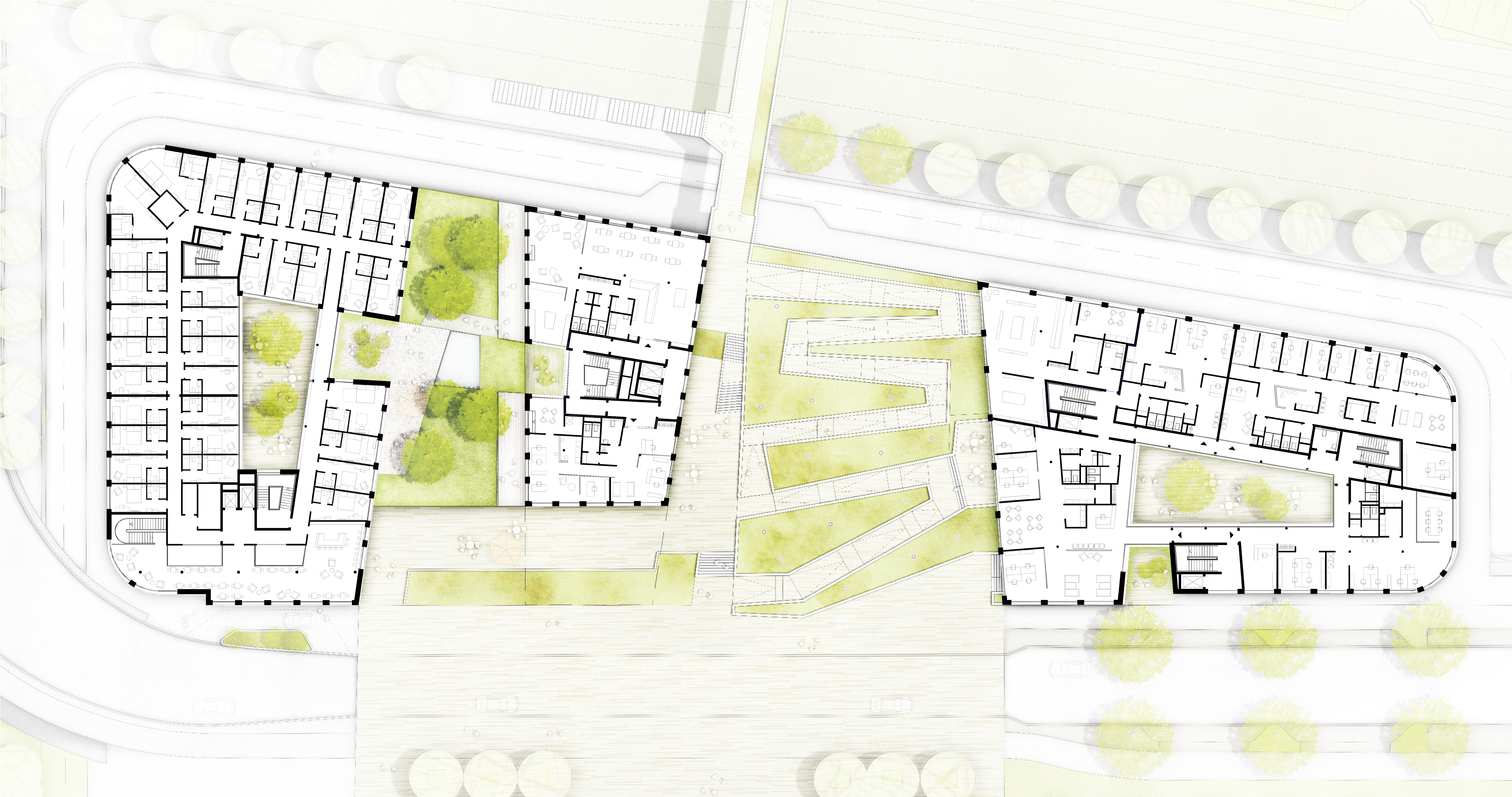 Baufeld CDurch eine gleichberechtigte Komposition von Baukörpern und Außenräumen entsteht eine gesamtheitliche Figur über die einzelnen Teilfelder des Grundstücks hinweg. In einem Dreibund aus trapezförmigen Hauptbausteinen ist der Hochpunkt des mittleren Feldes als Ausrufezeichen am unmittelbaren Knotenpunkt der Entwicklungsachsen noch einmal besonders herausgearbeitet.