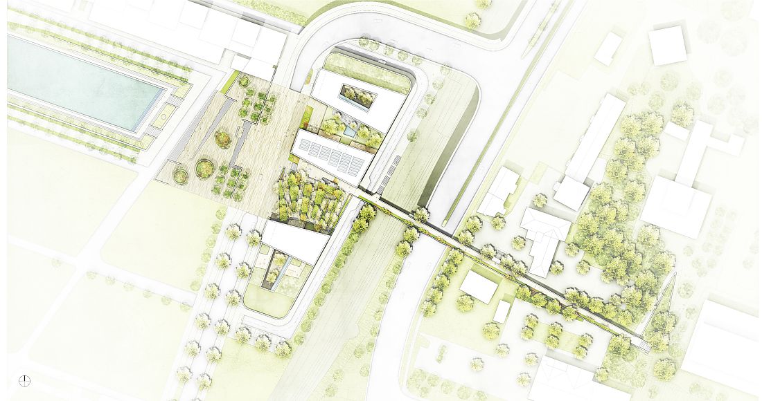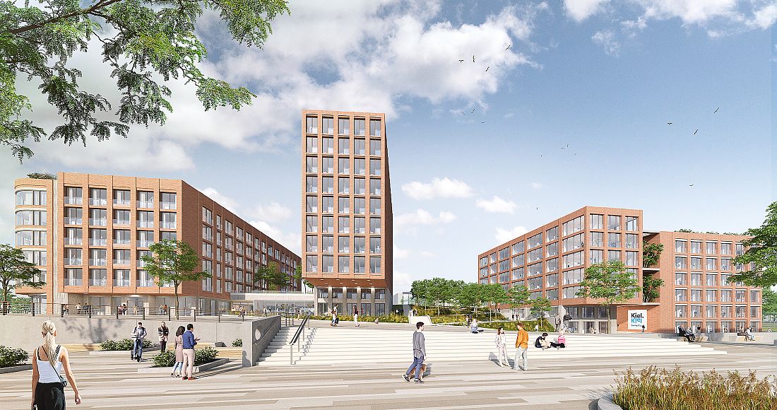 Mit der Vollendung der Wegeverbindung zwischen Innenstadt und Gaarden soll zugleich ein „Grüner Brückenschlag" als neue Freiraumtypologie zwischen Gaarden und Hörn entstehen. Eine gefaltete Landschaft aus Treppen, Rampen und Terrassen fängt die Reliefenergie auf und verknüpft Brücke, Ernst-Busch-Platz und die anliegenden Gebäude. Durch Höhenstaffelung, Richtungsänderung und den hoch aufgeasteten lichten Hain entstehen Sichtbeziehungen zwischen Architektur und Hafenkante.