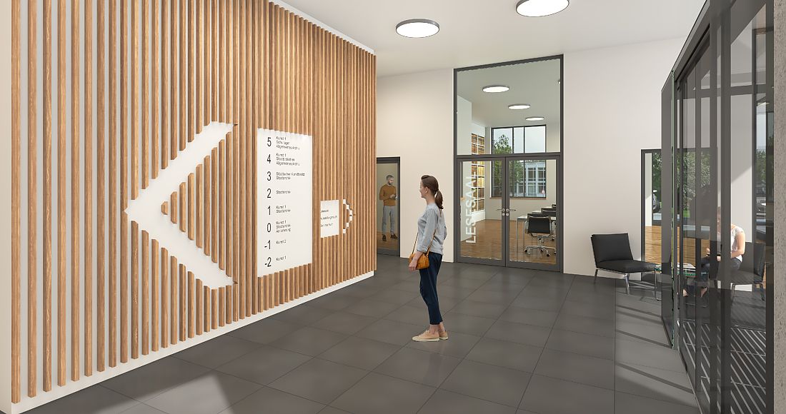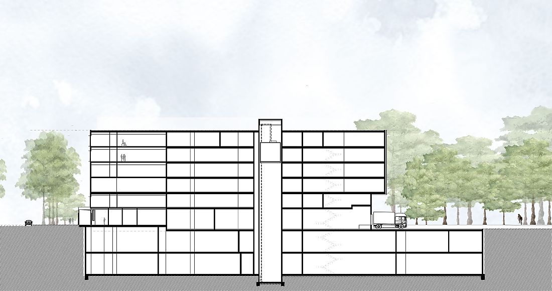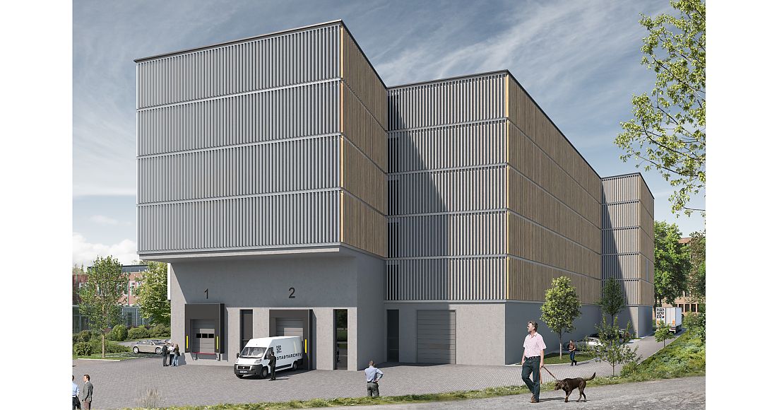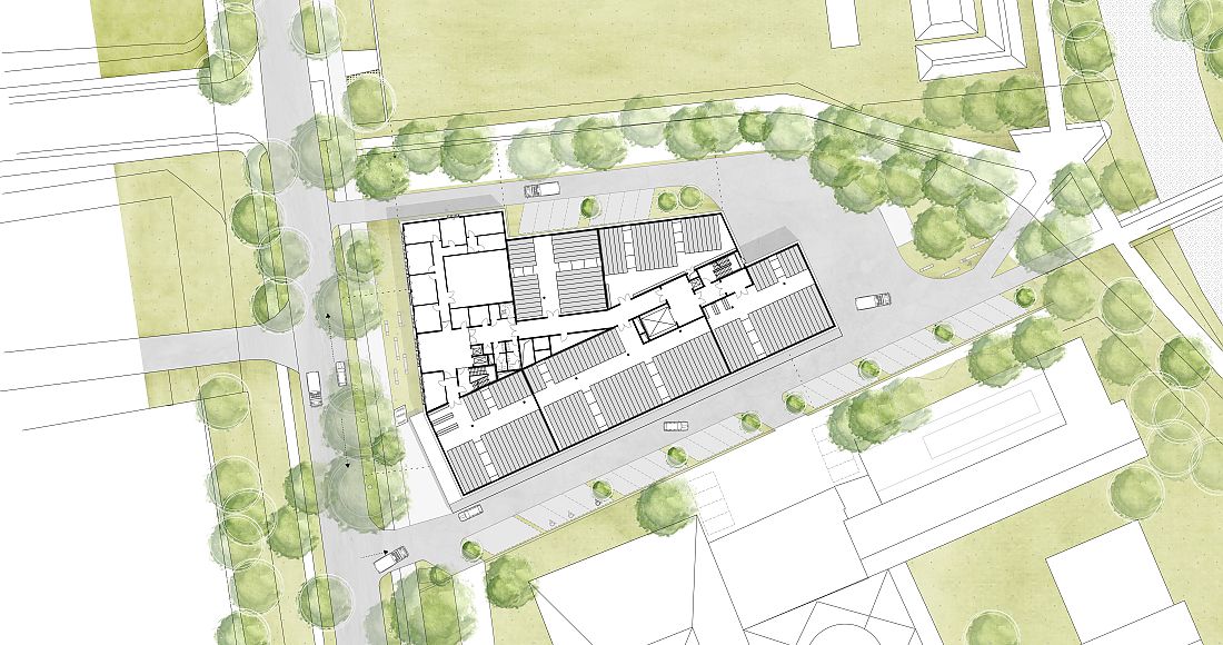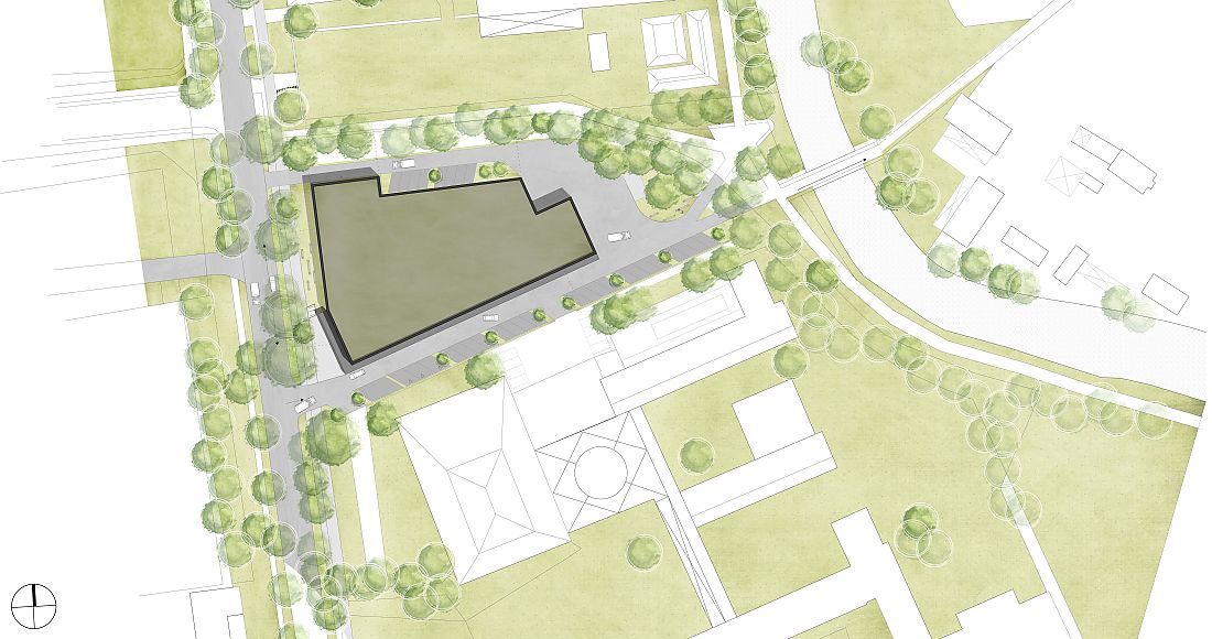 Der Entwurf zeigt sich mit seiner prägnanten und kompakten Kubatur in sechs oberirdischen Geschossen als selbstbewusster Solitär.