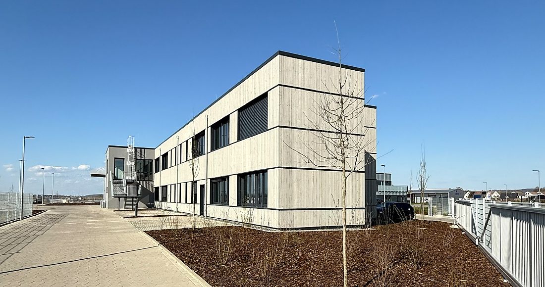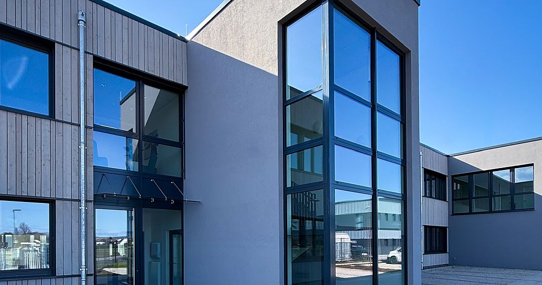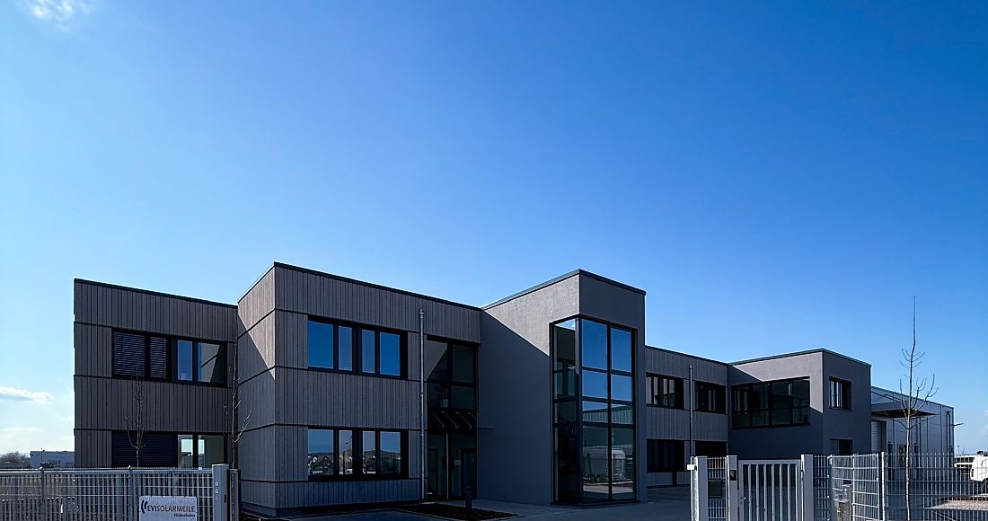 In der Samtgemeinde Leinebergland entsteht zentral in einem neuerschlossenen Gewerbegebiet der neue Firmensitz eines Anbieters von Photovoltaik-Lösungen. Der zweigeschossige Bürotrakt zeigt sich in eingegrünter Lage zum Straßenraum und bietet moderne Arbeitsplätze in Ein-, Zwei- und Vierpersonenbüros. Die modulare Fassadenoptik knüpft thematisch an das Kerngeschäft an. Im Grundstücksinneren weitet sich das Gebäude funktional auf. Dort dockt der eingeschossige Hallentrakt an, der sich in klarer und einfacher Formensprache zurücknimmt und der rings umfahren werden kann.
