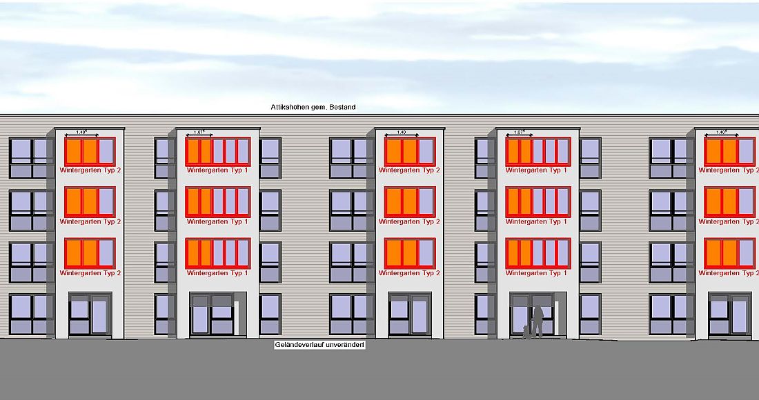 Die Fassadenflächen erhält eine Wärmedämmung mit Putzflächen und Verblenderriemchen. Dabei wird durch den Materialwechsel die vorhandene Gebäudekubatur mit Vor- und Rücksprüngen aufgenommen. Die Balkone der Obergeschosse werden mit einem Glasfaltwandsystem in Wintergärten umgewandelt und Bestandteil der thermischen Hülle. Somit wird die Balkonfläche über das gesamte Jahr nutzbar und ein lärmintensiver Abriss umgangen.