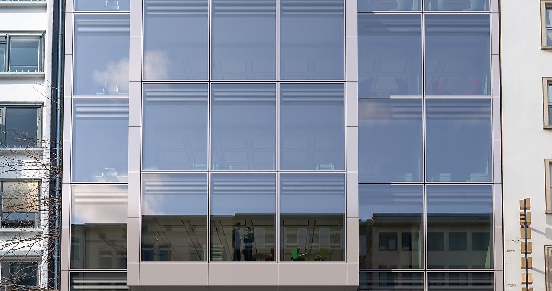 Die Straßenfassade erhält ein zeitgemäßes Erscheinungsbild. Die gläserne CCF-Fassade wird durch einen 3-geschossigen Erkervorbau gegliedert. Eine entsprechende Vordachkonstruktion im Erdgeschoss markiert den Eingangsbereich zur Filiale.