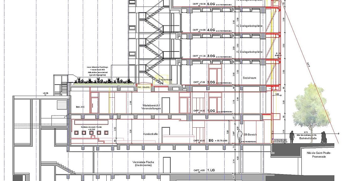 Die Sparkassenfiliale im Erdgeschoss ist zukünftig der „Flagstore“ für die online basierten Kundenangebote. Räumlichkeiten für persönliche Kundenberatungsgespräche und die Möglichkeit für kleine Kundenveranstaltungen sind im 1.Obergeschoss angeordnet. Dafür wird neben einem rollstuhlgerechten Aufzug über alle Geschosse auch eine neue Kundentreppe als Stahl-/ Glaskonstruktion eingebaut. In den Obergeschossen werden ca. 40 Arbeitsplätze für online Beratungsgespräche Raum finden.