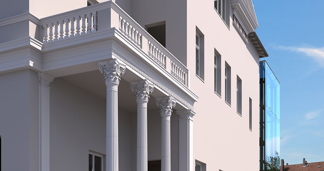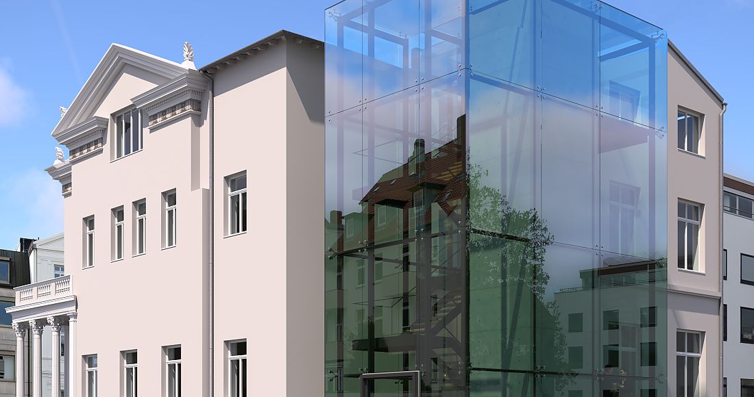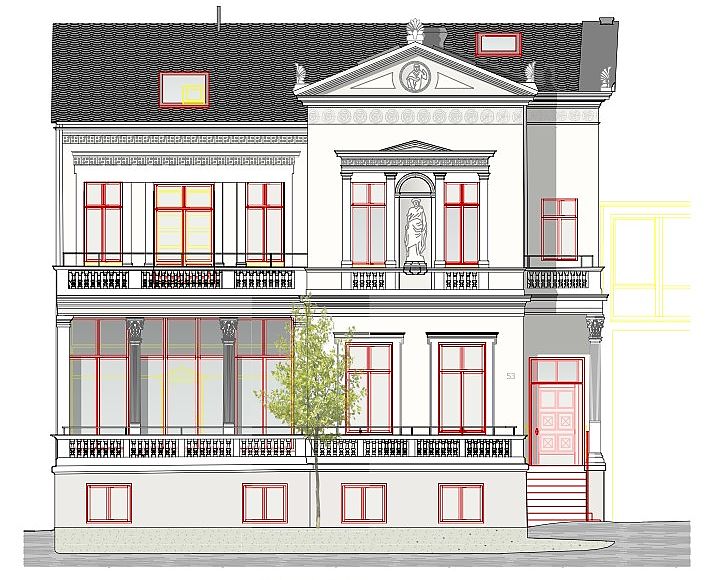 neuen Treppenhauses mit Aufzug geplant, um eine barrierefreie Erschließung aller Geschosse zu ermöglichen. Hierfür wird ein späterer Anbau bis auf das Kellergeschoss zurück gebaut und durch ein neues Treppenhaus in Stahl-Glas-Konstruktion ersetzt. Die Nutzung als Büro- und Verwaltungsgebäude bleibt unverändert. Zudem werden Fassadenelemente und Fenster in Abstimmung mit dem Denkmalamt an den historischen Zustand angelehnt und der ursprüngliche Eingang wiederhergestellt. Alle Maßnahmen erfolgen im Bestand und in enger Abstimmung mit der Denkmalpflege.